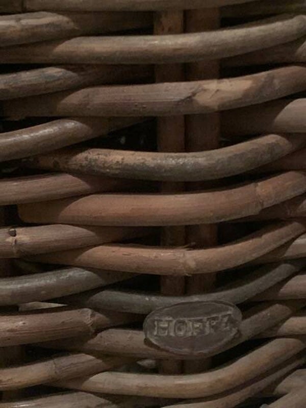 de mand is afgewerkt met lederen hengsels. De mand is natuurlijk gekleurd (niet gespoten)